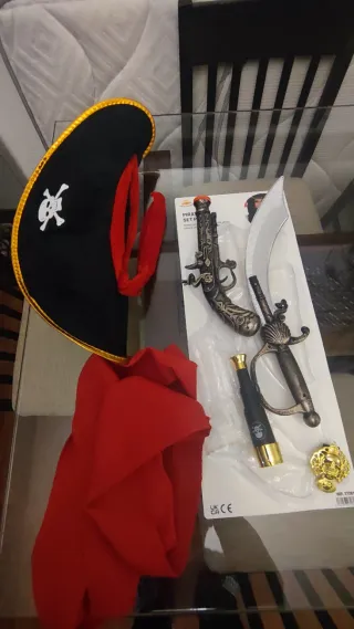 Completa tu disfraz de pirata con este set de accesorios. - Incluye sombrero negro con calavera y detalles dorados. - Espada de pirata con empuñadura detallada. - Pistola de juguete de estilo antiguo. - Pañuelo o fular rojo. - Moneda dorada de pirata. - Telescopio pequeño. - Fajin rojo cintura. Usado una vez.