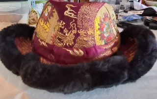 Este sombrero tradicional de lama tibetano es perfecto para el invierno. Presenta un diseño intrincado con motivos de dragones forrado en seda bordada detallados en hilo dorado sobre un fondo de color vino/burdeos,a menudo usadas en ceremonias,festivales o como indumentaria de invierno en regiones como el Tíbet,Nepal y zonas de Mongolia. Es de 4 solapas(cuadrangular) que se pliegan o bajan para cubrir las orejas y nuca en climas fríos. Está adornado con bordados dorados. Es precioso. Me lo trajo un tibetano de la India hace mucho tiempo. Utilizado como adorno en una habitación con otros motivos tibetanos.