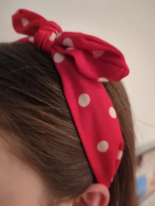 Diadema con un diseño divertido y llamativo, perfecta para añadir un toque de estilo. - Tejido rojo con lunares blancos. - Lazo grande en la parte superior, puede mover de sitio o también quitar. Solo venta durante curso escolar.