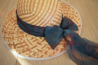 Sombrero de entrelazados de fibra vegetal marrón con lazo de colores azules. Alguna hebra está dañada
