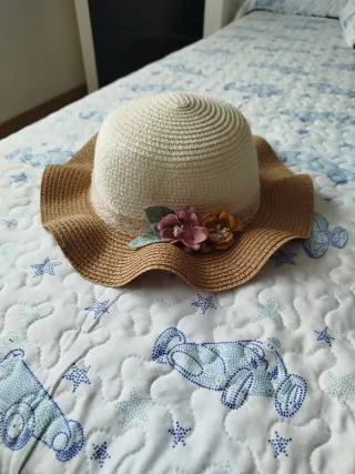 Sombrero de paja de color beige con un estampado de hojas en azul marino, talla 10 años. Es un accesorio elegante y veraniego, ideal para protegerte del sol. Tiene una cinta azul marino alrededor de la base. El diseño de hojas es discreto y estilizado. En perfecto estado. Se hacen envíos. Más cosas en mi perfil.