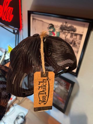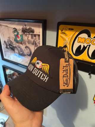 Gorra de la marca Von Dutch en color negro. Presenta un diseño llamativo con un ojo alado. - Cierre de cremallera en la parte trasera. - Parche bordado con el logo y el nombre de la marca. Nueva a estrenar.