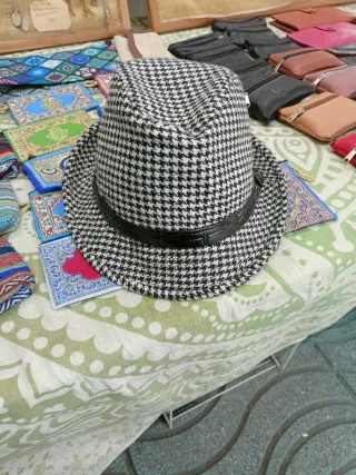 Sombrero con un clásico estampado de pata de gallo. Un accesorio con estilo. - Diseño de pata de gallo en blanco y negro. - Banda decorativa en la base.