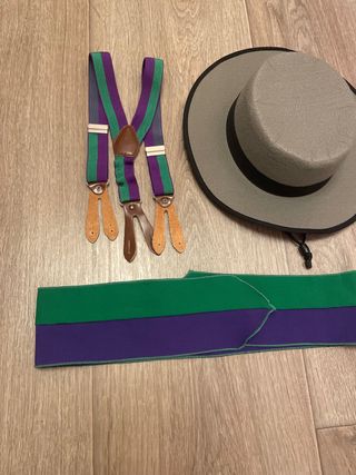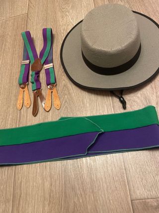 Conjunto de flamenco que incluye sombrero, tirantes y fajín. - Sombrero gris con cinta negra. - Tirantes con rayas moradas, verdes y grises. - Fajín de tela en color morado y verde.