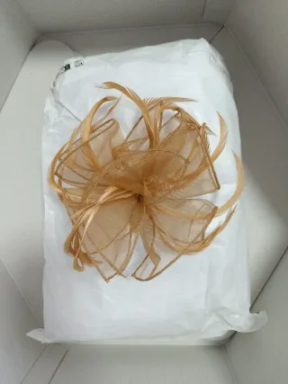Elegante tocado para ceremonias, usado una sola vez. - Diseño con plumas y tela. - Color dorado.