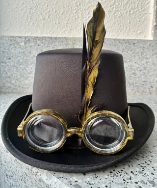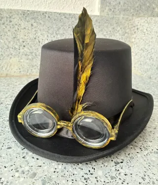 Espectacular sombrero de copa hecho a mano, perfecto para amantes del estilo Steampunk, festivales, carnaval o eventos de disfraces Base de sombrero negro de copa media, decorado artesanalmente. Con gafas de aviador integradas con un acabado en pintura dorada envejecida/metálica que le da un toque vintage muy auténtico y una pluma pintada en tonos negros y dorados a juego. Cómodo y ligero. Ideal para completar un outfit gótico o retro-futurista, carnaval, fiestas de disfraces… ¡Una pieza exclusiva que no encontrarás en tiendas!