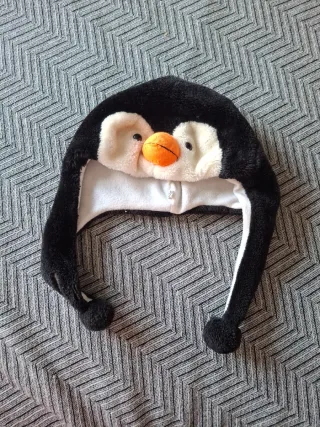 Divertido gorro con forma de pingüino, ideal para mantener el calor con estilo. - Diseño de pingüino con cara y pico. - Orejeras con pompón. - Material suave y peludo.