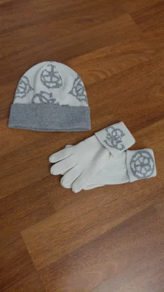 Conjunto de gorro y guantes de la marca Guess. Usado 2 veces. - Diseño con estampado. - Combinación de colores blanco y gris.
