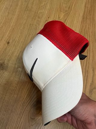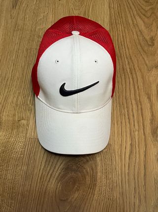 Gorra de golf de la marca Nike. - Diseño con paneles frontales blancos y traseros de malla roja. - Logo de Nike en contraste en la parte frontal.
