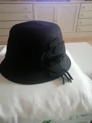 Elegante sombrero negro con un detalle de flor. - Material de fieltro. - Adorno floral. - Diseño clásico.