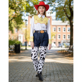 Disfraz de Jessie de Toy Story, talla M, que incluye sombrero rojo. - Camisa blanca con detalles amarillos. - Pantalones vaqueros con estampado de vaca. - Cinturón con hebilla dorada. - No incluye Botas negras. ideal para Halloween, carnaval o cualquier evento de cosplay donde se requiera un personaje enigmático y llamativo. Envio rapido seguro y garantizado a estrenar totalmente nuevo y empacado a estrenar. Recibelo antes de 48-72 hrs (España), Italia y Portugal antes de 4 dias laborables.