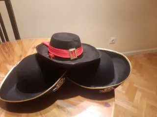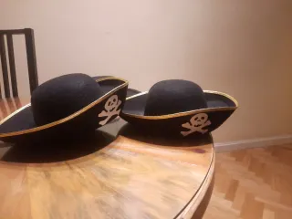 Dos sombreros de carnaval con diseño de pirata. - Adornados con borde dorado. - Detalle de calavera y tibias cruzadas. 2 euros la unidad.