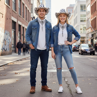 Conjunto de sombrero de vaquero y bandana con un diseño inspirado en el estilo western. Talla Unica para Adulto Hombre y/o Mujer. - Sombrero con estampado de vaca. - Bandana con detalles gráficos. - Paquuete incluye 2 pcs: Sombrero cowboy y Pañuelo Bandana western. Ocasiones: Carnaval, Halloween, fiestas temáticas, cumpleaños, Teatro y Eventos de fantasía, Cosplay. Tenemos las dos opciones de entrega: 1. Entrega fisica en mostoles programada. 2. Envió rápido seguro y garantizado entrega express 48 hrs - 72 hrs (España). Italia y Portugal (3-4 dias).