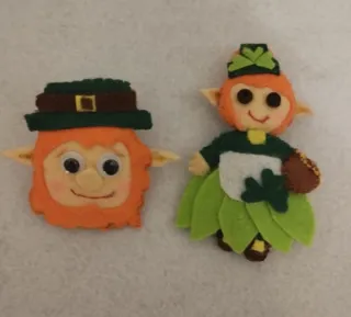Conjunto de dos broches artesanales de fieltro, perfectos para celebrar el Día de San Patrick - Diseño de duendes con sombrero. - Detalles de tréboles. - Hechos a mano con materiales de calidad.