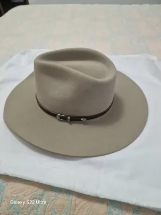 Sombrero Stetson de fieltro en color beige. Diseño clásico de ala ancha. - Banda decorativa de cuero. Sin uso latía 57