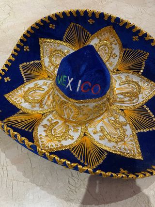 Sombrero charro tradicional mexicano, ideal para fiestas o decoración. - Diseño con bordados dorados. - Detalle de lentejuelas. - Inscripción MEXICO en la copa. Comprado en Mexico. 60 cm de diametro
