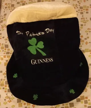 Sombrero temático de San Patricio con el logo de Guinness. Perfecto para celebraciones. - Diseño negro con detalles verdes. - Adorno de trébol.