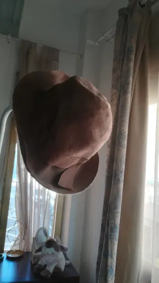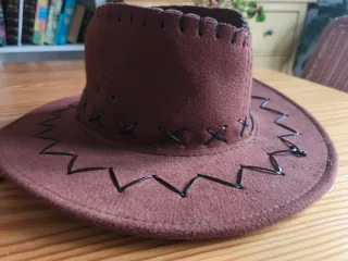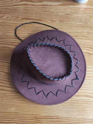 Sombrero de estilo vaquero, ideal para disfraces o fiestas temáticas. Su diseño imita la apariencia del ante o gamuza. - Costuras decorativas en el borde. - Detalle de puntadas en la copa y el ala.