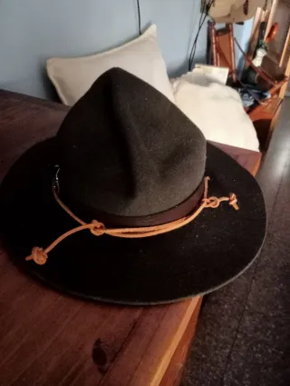 Sombrero estilo Boy Scout, con un diseño clásico y atemporal. Ideal para coleccionistas o para darle un toque único a tu estilo. - Banda decorativa de cuero. - Cordón con nudos. - Material de lana.