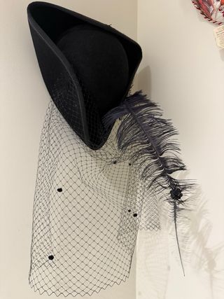 Elegante sombrero veneciano con un toque distintivo. - Diseño triangular. - Adornado con velo de red y plumas. - Detalle de pequeños puntos en el velo.