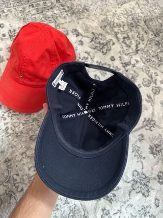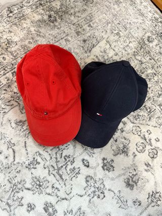 Pack de dos gorras de la marca Tommy Hilfiger. - Una gorra de color rojo, en muy buen estado, talla M. - Una gorra de color negro, prácticamente nueva, talla XL.