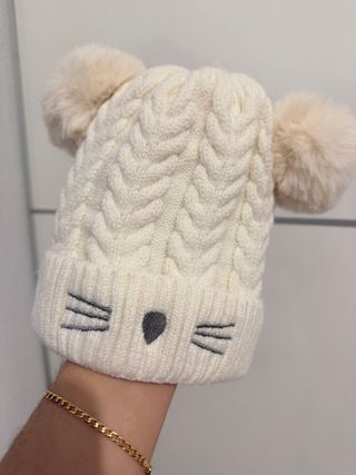 Gorro de lana tejido con un diseño encantador, perfecto para mantener a las pequeñas abrigadas. Presenta un adorable detalle de cara de gatito bordado en la parte delantera y dos pompones suaves en la parte superior. - Tejido de punto trenzado. - Adorno de cara de gatito bordado. - Dos pompones de pelo sintético.