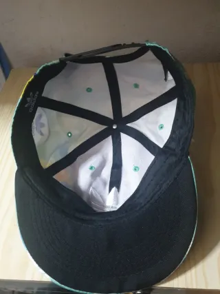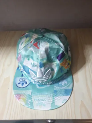 Gorra con un diseño llamativo y moderno. - Estampado con múltiples logos de Adidas. - Tonos verdes y azules predominantes.