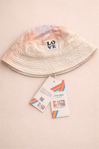 Sombrero tipo bucket de Jack & Jones con un diseño tie-dye y el logo LOVE. - Estampado tie-dye en tonos pastel. - Parche con la palabra LOVE en la parte frontal. - Nuevo. Solamente envíos.