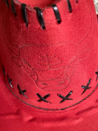 Sombrero de vaquero estilo clásico. - Diseño con costuras negras. - Detalle de un toro grabado en la parte frontal.