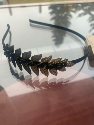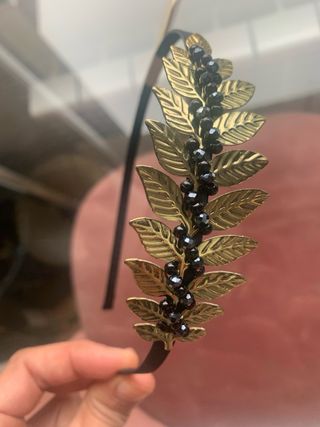 Elegante diadema con diseño de hojas y detalles de perlas. - Adorno de hojas metálicas. - Incrustaciones de pequeñas perlas negras.