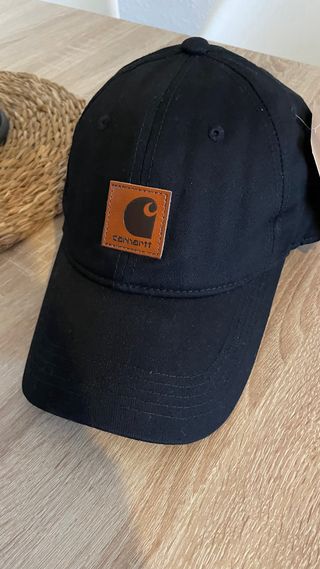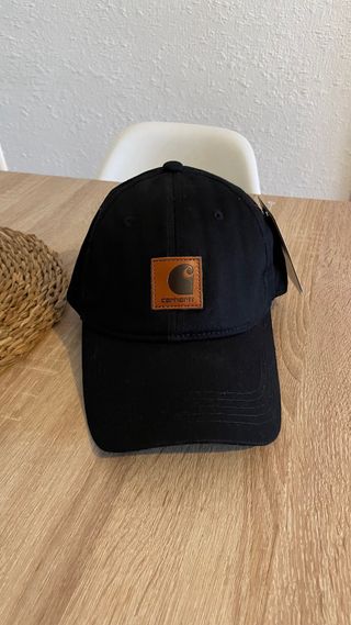 Gorra negra de la marca Carhartt con el logo en marrón y bordado en la parte trasera. Nueva, con etiqueta.