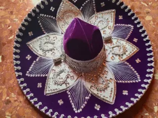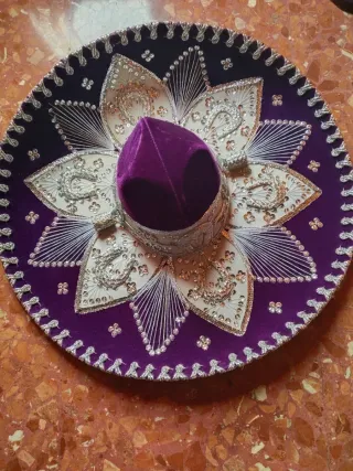 Sombrero charro mexicano con un diseño intrincado y elegante. - Bordado a mano con detalles plateados. - Adornado con lentejuelas brillantes. - Corona central de terciopelo morado. Traído desde México hace 25 años