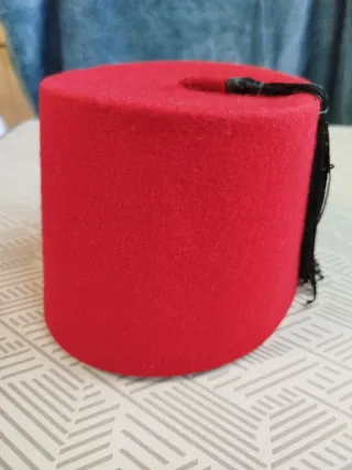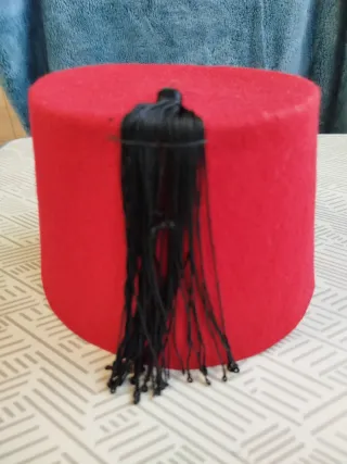 Fez, también conocido como tarbush, un tocado masculino tradicional hecho de fieltro rojo con una borla negra. Origen histórico: Se popularizó en el siglo XIX en el Imperio Otomano y el norte de África, tomando su nombre de la ciudad de Fez en Marruecos. Significado social: Inicialmente utilizado como un símbolo de modernización y uniformidad social en la sociedad otomana, reemplazando al turbante. Fabricación: Tradicionalmente se elabora moldeando fieltro de lana y se tiñe con tintes carmesí. Altura 14 cms, diámetro superior 14,5 cms, diámetro inferior 19 cms. Talla 6. En perfecto estado. Sí se hacen envíos.