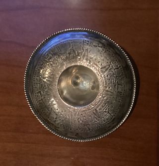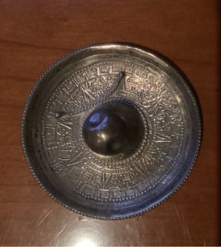 Este sombrero mexicano está hecho de plata y presenta un diseño intrincado. Plata con marca en el,sombrero de 925, Peso 40 gramos, medida diámetro 9 cm. Comprado en México en 1992. - Diseño inspirado en el calendario azteca. - Borde decorado con un cordón trenzado.