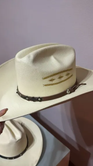 Sombrero hecho en México, con un diseño elegante. - Color beige con adornos dorados. - Banda de cuero con detalles. - Estilo vaquero clásico.