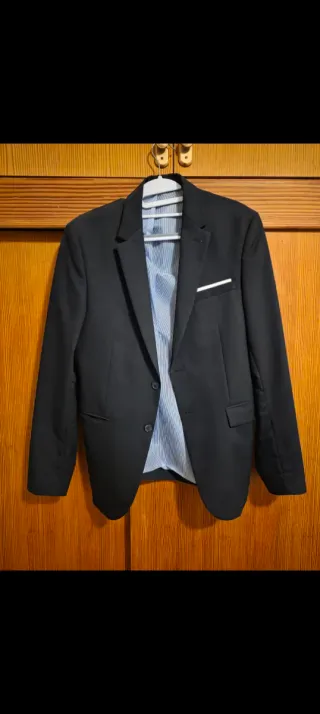 Chaqueta americana de color negro, ideal para ocasiones formales o para darle un toque elegante a tu atuendo, se ha usado una vez, perfecta para noche vieja. - Diseño clásico de solapa. - Cierre de dos botones. - Bolsillo de pecho con detalle. - Forro interior a rayas.