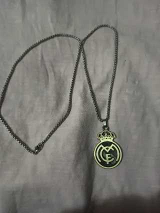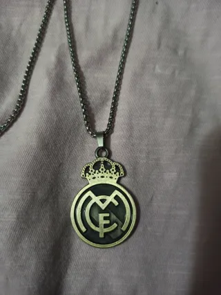 Collar con el escudo del Real Madrid. - Diseño circular con corona. - Acabado en tonos dorados y plateados.