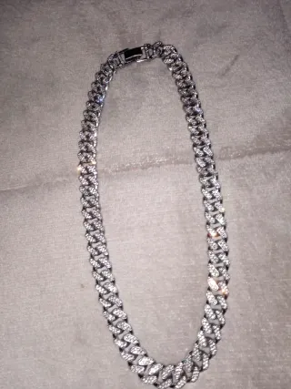Elegante conjunto de reloj y cadena cubana con incrustaciones de diamantes. - Diseño llamativo y brillante. - Acabado plateado y blanco.