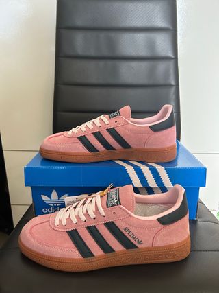 Zapatillas Adidas Handball Spezial en color rosa claro con detalles en azul marino y suela de goma marrón. - Diseño clásico. - Material de ante. - Cordones blancos.