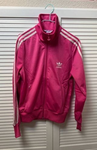 Adidas Originals Firebird La sudadera mas mítica de Adidas en su versión lux con los detalles de la cremallera con el logo de la flor de Adidas. Sudadera rosa fucsia con los logotipos y las rayas en blanco, prácticamente nueva, el logo trasero está perfecto, cremallera perfecta, puesta un par de veces.