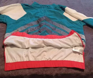 Sudadera de estilo retro con un diseño vibrante y llamativo. - Mangas con bloques de color blanco y verde azulado. - Detalle de rayas en zigzag en la parte delantera. - Puños y cintura elásticos en color rojo. - Obertura lateral