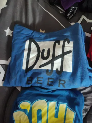 Conjunto de ropa infantil con diseños de Duff Beer y Adidas. - Camiseta azul con estampado Duff Beer. - Sudadera roja con logo de Adidas. - Camiseta azul con personaje de Los Simpson. - Camiseta azul marino. - Pijama de Simpson