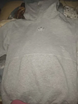 Sudadera con capucha Adidas de color gris. Está en buen estado. - Talla grande. - Logo Adidas en negro. - Bolsillo delantero.