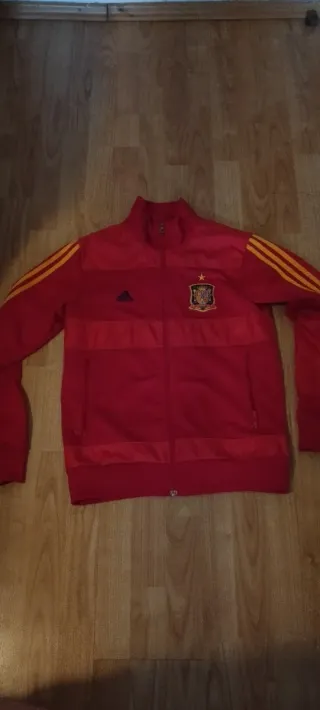 Sudadera deportiva de España con el logo de Adidas. - Diseño en color rojo. - Detalles de las tres franjas en las mangas. - Escudo de la selección española bordado en el pecho.
