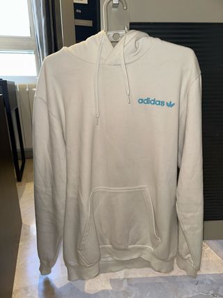 Sudadera con capucha de Adidas en color blanco. Presenta un diseño minimalista con el logo de la marca en pequeño. - Logo de Adidas en azul. - Bolsillo canguro delantero. - Capucha con cordones.