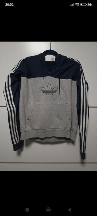 Sudadera Adidas con capucha, talla M. Está en perfecto estado. - Diseño bicolor en azul marino y gris. - Tres bandas blancas en las mangas. - Bolsillo delantero.