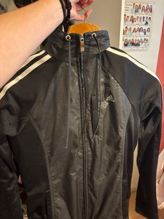 Chaqueta deportiva Adidas Originals en color negro oficial. Diseño clásico con las tres rayas. Con alguna pelusilla pero muy bien - Cierre de cremallera. - Cuello alto. - Bolsillos laterales con cremallera.