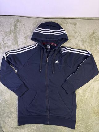 Sudadera con cremallera de la marca Adidas. Presenta el diseño clásico de tres rayas en las mangas. - Cierre completo con cremallera. - Capucha con cordones ajustables. - Bolsillos frontales tipo canguro.