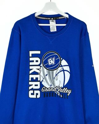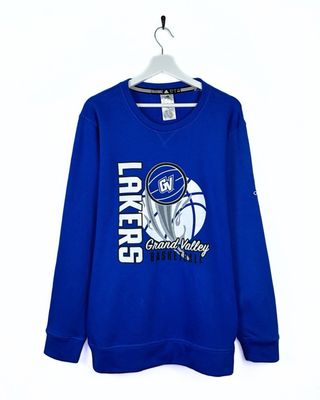 Sudadera deportiva con diseño de baloncesto. - Color azul vibrante. - Estampado frontal con Lakers y Grand Valley Basketball. - Logo de Adidas en la manga.
