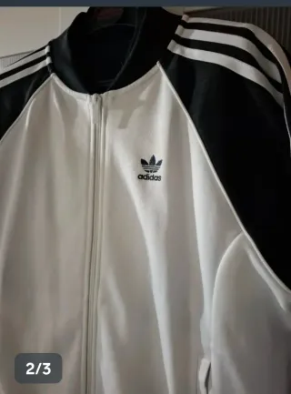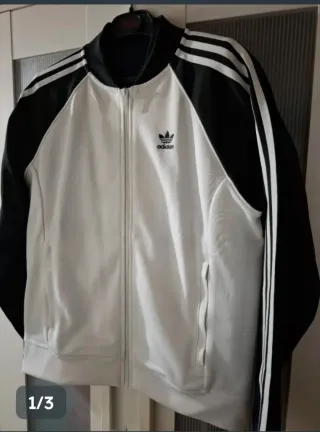 Chaqueta deportiva con un diseño clásico y moderno. - Mangas y cuello en color negro. - Cuerpo principal en color blanco. - Tres rayas características en las mangas. Utilizada para una sesión de fotos. 1 día Esta nueva! PVP79€